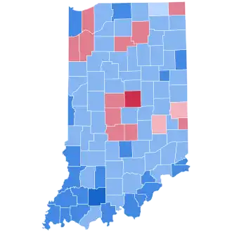 This is the only time that Randolph County and Wabash County voted for a Democratic presidential candidate.[3] This was also the first time Indiana voted Democratic since 1936.[4] As of the 2024 presidential election, this is the last election in which the following counties voted for a Democratic presidential candidate: Allen, Adams, Bartholomew, Brown, Benton, Carroll, Cass, Clay, Clinton, Daviess, Decatur, DeKalb, Elkhart, Fayette, Fountain, Franklin, Grant, Hancock, Henry, Howard, Huntington, Jackson, Jay, Jennings, LaGrange, Lawrence, Marshall, Miami, Montgomery, Noble, Orange, Parke, Pulaski, Putnam, Ripley, Shelby, Tipton, Warren, Wells, White, and Whitley.[5]