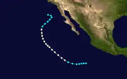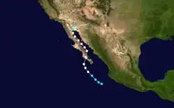 The first storm to make landfall, Katrina formed on August 30.[14] It became the third hurricane of the season 30 hours after it was named. The night that Katrina became a hurricane, it made landfall on the Baja Peninsula with winds of 85 miles (137 km) per hour. It emerged soon after and paralleled the peninsula until making landfall at the head of the Bay of California. It rapidly weakened to a tropical depression and dissipated over Arizona.[15][16]
