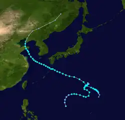 On September 14, Hurricane Sarah, which formed across the International Date Line, entered the Western Pacific. Immediately after the first advisory following Sarah's entrance into the West Pacific, it was upgraded to a minimal typhoon. Typhoon Sarah continued to intensify, and late on September 15, it was upgraded to a Category 4 typhoon. The next day, Sarah reached its peak intensity, attaining 150 mph winds and a 932 millibar (mbar) pressure reading (this was the only pressure measurement retrieved from the typhoon), making the system a super typhoon. Sarah began gradually weakening afterwards, and late on September 21, it became extratropical; it was still an 80 mph Category 1 typhoon at the time.
