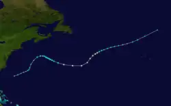 A subtropical depression developed at 12:00 UTC on September 14, while located about 295 mi (475 km) southeast of Cape Hatteras, North Carolina, initially moving east-northeastward. Early on September 16, it briefly curved north-northwestward and strengthened into a subtropical storm, before turning back to the east-northeast later that day. By September 17, the storm re-curved to the southeast and decelerated, before accelerating again on September 19. Strengthening continued, with the storm becoming a Category 1-equivalent subtropical cyclone early the following day. At 00:00 UTC on September 22, it peaked with maximum sustained winds of 85 mph (135 km/h) and a minimum barometric pressure of 976 mbar (28.8 inHg). Accelerating northeastward, a weakening trend soon commenced. The subtropical storm became extratropical by 12:00 UTC on September 22.[8]