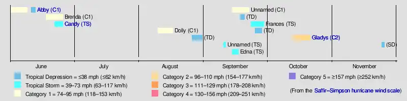 The 1968 Atlantic hurricane season was a below average hurricane season during which only nine nameable storms developed. The season officially began on June 1 and lasted until November 30, dates which conventionally delimit the period of each year when most tropical cyclones form in the Atlantic basin. Of the named storms, five strengthened into hurricanes; none however intensified into a major hurricane.[nb 1] Only four other seasons since the start of the satellite era—1972, 1986, 1994, and 2013—did not feature a major hurricane. The first system, Hurricane Abby, developed in the northwestern Caribbean on June 1. Abby moved northward and struck Cuba, bringing heavy rainfall and flooding to western portions of the island. Making landfall in Florida on June 4, Abby caused flooding and spawned four tornadoes, but left behind little damage. Overall, the hurricane resulted in six deaths and about $450,000 (1968 USD) in damage.[nb 2] In late June, Tropical Storm Candy brought minor flooding and spawned several tornadoes across portions of the Southern United States. Overall damage from the cyclone reached approximately $2.7 million. 1968 featured two simultaneously active tropical storms during the month of June, a phenomenon that would not occur again until 2023.[2]