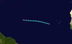 A tropical wave emerged into the Atlantic Ocean from the west coast of Africa on September 10. A weak high-level trough and a warm anticyclone to the east-northeast generated low wind shear,[4] allowing a tropical depression to develop at 18:00 UTC on September 13, while located about 225 mi (360 km) southeast of Praia, Cape Verde.[8] Although satellite imagery indicated a well-defined system, the cyclone did not organize further until the following day, when it became a tropical storm at 06:00 UTC. Upon doing so, Edna quickly gained strength. Early on September 15, the ship Sal Mela observed wind speeds of 69 mph (111 km/h), indicating that Edna was approaching hurricane status.[4] At 00:00 UTC, Edna attained its peak intensity with maximum sustained winds of 70 mph (110 km/h), which it maintained for 18 hours.[8] On the next day, a cold upper-level trough began producing unfavorable conditions, causing Edna to degenerate into a tropical depression by 06:00 UTC on September 17.[4] Edna degenerated into a tropical wave early the following day, while situated about 395 mi (635 km) east of Barbuda.[8]