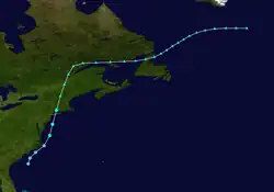 An upper-level trough and attendant frontal boundary moved into the western Atlantic on September 8. The next day, an area of low pressure formed on the tail-end of this front and began to organize as it moved westward. Surface observations suggested the formation of a tropical depression by 00:00 UTC on September 10. The newly formed system curved north-northeast in advance of another trough and intensified into a tropical storm while passing offshore the Carolinas. On September 11, it attained peak winds of 65 mph (100 km/h), a strength it maintained while making landfall in Long Island, New York, around 10:00 UTC that day. A few hours later, the storm transitioned into an extratropical cyclone as it became intertwined with a front. It crossed Newfoundland into the North Atlantic, interacting with another non-tropical low before dissipating on September 17.[5]