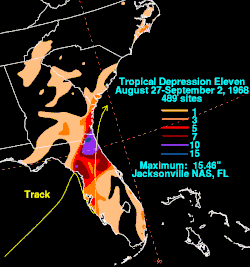 On August 26, a tropical depression developed in the northeastern Gulf of Mexico. Drifting northeastward, the depression was situated offshore Central Florida on August 28, shortly before it trekked southward and made three landfalls in Florida near Clearwater, Holmes Beach, and Venice. By early on August 29, the depression began moving northeast to north-northeastward across the state. Late on August 31, the system emerged into the Atlantic Ocean near Atlantic Beach and dissipated shortly thereafter. Due to the depression's slow movement across Florida,[4] heavy rainfall was observed, including 15.46 in (393 mm) of rainfall in Jacksonville.[15] Considerable flooding was reported in Clay and Duval counties. Along the upper Cedar River in the latter, many homes and businesses were flooded. Eleven bridges were inundated with water ranging from a few inches to 4.5 ft (1.4 m). Peak discharge amounts were higher than during Hurricane Dora in 1964. However, soil moisture and streamflow conditions during Dora were much more conducive to producing floods than antecedent conditions associated with this depression.[20] Further south in Daytona Beach, a tornado destroyed a motel and several homes.[4]
