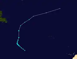 A tropical wave developed into a tropical depression near the Windward Islands on August 29.[2][4] Initially, the depression slowly strengthened while moving west-northwestward and was upgraded to Tropical Storm Francelia until more than 24 hours later. While located north of Honduras, it curved west-southwestward and was upgraded to a hurricane on September 1. Late on September 3, Francelia made landfall near Punta Gorda, Belize with winds of 100 mph (160 km/h). The storm quickly weakened inland, and less than 24 hours later, it dissipated over northern Guatemala.[2] However, the remnants of Francelia later contributed to the development of Hurricane Glenda in the eastern Pacific Ocean.[4]