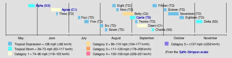 Tropical cyclogenesis first occurred in the month of May, with the development of Subtropical Storm Alpha. The month of June featured three tropical cyclones, including Hurricane Agnes and two tropical depressions. Three more systems formed in July, though all of them failed to reach tropical storm status. August was the most active month of the season, with five systems, including Hurricane Betty, Tropical Storm Carrie, and three tropical depressions. September featured slightly less cyclogenesis, with Hurricane Dawn, Subtropical Storm Charlie, and two tropical depressions. An additional three tropical depressions formed in October. Subtropical Storm Delta was the sole system in November, lasting from November 1 to November 7.[5]