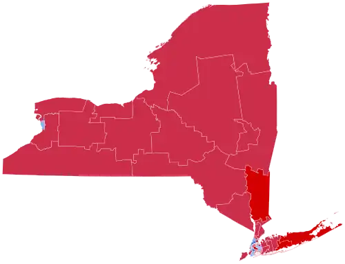 Nearly all counties in New York State turned out for Nixon, and only the New York City boroughs of Manhattan, Brooklyn and the Bronx voted for McGovern. McGovern was able to win New York City overall with his victories in these three boroughs, taking two-thirds of the vote in Manhattan and also winning majority votes in Brooklyn and the Bronx. However, Nixon was able to put in a relatively strong performance citywide, winning 56% of the vote in Queens and 74% of the vote in Staten Island. 1972 remains the last election in which a Republican presidential nominee has won any New York City borough other than Staten Island, Queens being a heavily populated county that was historically key to Republican competition in New York. This was also the last election in which a Republican presidential nominee has won the upstate counties of Erie County, where the city of Buffalo is located, and Albany County, where the state capital of Albany is located, as well as in turn, the last Republican to win every county of upstate New York.[1] Both of these counties have become solidly Democratic in the years that have followed.