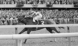 - ^ The previous course record was 2:26+3⁄5, set by Gallant Man in 1957.[7] The largest margin of victory at the Belmont Stakes before the 1973 race was set in 1943, when Count Fleet won by 25 lengths.[7] Secretariat's 2:24 to cover 1.5 miles equates to an average speed of 37.5 miles per hour (60.4 km/h).[21]