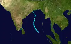 This system formed as a tropical depression in the southern Bay on December 5, strengthening into a tropical storm as it turned north-northwest on December 5, then to near-hurricane strength on December 6. The cyclone recurved, striking Indian near Calcutta on December 9, though its main impacts were across Bangladesh.[4]