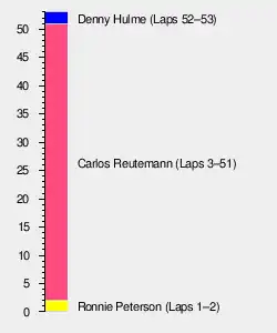 After Hunt spun later on the opening lap, Reutemann moved into second, with Fittipaldi, Hailwood, Ickx and Hulme completing the top six. By lap three, Reutemann took the lead, while Fittipaldi visited the pits to have a plug lead reattached. This promoted Hailwood to third. By this stage, Ickx had dropped behind Hulme, but soon both were past the Yardley McLaren. Peterson began to fade due to brake trouble and was overtaken by Hulme and Ickx. By now Ickx was beginning to come under pressure from the Ferrari of Niki Lauda.[2]