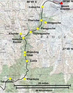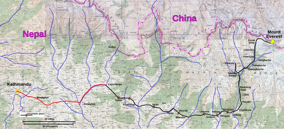 7. ^ The route is still used for trekking – although there is now a road that penetrates as far to the east as Jiri it does not reach all the way to Khumbu.[35]