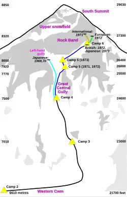 Spring 1970 Japanese expedition – the expedition climbed no higher than in the previous year (black—cyan route on the diagram). However, led by Saburo Matsukata, a party reached the summit via the South Col.[11]