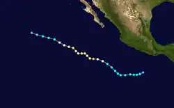 A small disturbance coincident with a tropical wave was first identified south of Acapulco on August 19.[4][5] The system moved west and coalesced into a tropical depression around 18:00 UTC on August 23.[6] The depression failed to intensify over subsequent days, and in fact, it was operationally downgraded back to a disturbance on August 26.[5] In the official database, the cyclone maintained its status and eventually intensified into Tropical Storm Miriam around 00:00 UTC on August 27.[6] Miriam turned west-southwest and entered the Central Pacific,[5] where it intensified into a hurricane at 12:00 UTC on August 28 and reached peak winds of 90 mph (140 km/h) twelve hours later.[6] Miriam then began to steadily weaken as it passed south of Hawaii,[5] and the cyclone dissipated after 00:00 UTC on September 2.[6]