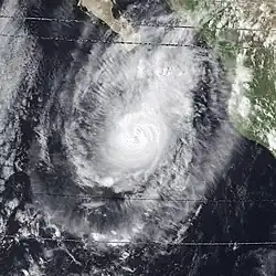 To the east of Tropical Storm Bud, a new tropical disturbance – originating as a Caribbean ITCZ disturbance – was identified south of Acapulco, Guerrero, on June 15.[4] The comparatively small system became a tropical depression around 06:00 UTC on June 17 and Tropical Storm Carlotta eighteen hours later while it moved over warm ocean waters.[5][6] After formation, Carlotta embarked toward the west-southwest, steered by the same ridge that directed Bud. The storm displayed a small eye in satellite imagery early on June 19,[5] and it was upgraded to a hurricane by 06:00 UTC that day.[6] Carlotta continued to intensify as it curved west-northwest,[5] becoming the season's first major hurricane around 06:00 UTC on June 20 and ultimately peaking as a Category 4 hurricane with winds of 130 mph (210 km/h) by 12:00 UTC on June 21.[6] Carlotta maintained its strength for a time before it encountered cooler waters and dry air on June 23.[5] The cyclone steadily lost strength and degenerated to a disturbance after 18:00 UTC on June 25 but remained a traceable entity as it moved across the Central Pacific. The disturbance moved across the Hawaiian island chain on June 28 and continued west, ultimately merging with a cold-core low after crossing the International Date Line. It was last identified over the West Pacific near Minami-Tori-shima on July 10.[7]