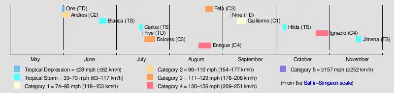 The season officially started on May 15, 1979 in the Eastern Pacific and on June 1 in the Central Pacific; they both ended on November 30, 1979. These dates conventionally delimit the period of each year when most tropical cyclones form in these basins.[3] The season's first storm, Andres, developed on May 31, while its last, Jimena, dissipated on November 18. In early June, Andres moved onshore Mexico as a minimal hurricane, while in late October, Ignacio struck the coastline as a tropical depression. Impacts from those storms were minimal, as were the effects of the preponderance of systems during the season. No casualties or damage were reported onshore, but two fishermen drowned offshore.[4]