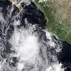 An area of disturbed weather formed south of the Gulf of Tehuantepec on September 7.[4] It organized into a tropical depression around 18:00 UTC on September 8 and intensified into Tropical Storm Guillermo twelve hours later.[7] Flow around the southwest side of upper-level ridging directed the storm to curve northwestward, while the system's track over warm waters allowed it to intensify. It became a hurricane with peak winds of 75 mph (121 km/h) around 18:00 UTC on September 11. Guillermo decelerated over cooler waters south of Baja California,[4] ultimately dissipating after 12:00 UTC on September 13.[7]