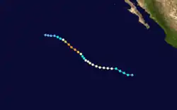 An area of disturbed weather was observed south of Guatemala on July 14.[4] It developed into a tropical depression around 06:00 UTC on July 17 and became Tropical Storm Dolores twelve hours later.[7] Moving along the south side of an upper-level area of high pressure, the cyclone passed over warm waters which facilitated its continued development.[4] It became a hurricane at 18:00 UTC on July 18 and then entered a period of rapid intensification, which coincided with the formation of a well-defined eye on satellite imagery.[4] Dolores strengthened into the season's first major hurricane around 06:00 UTC on July 20 and, after a brief fluctuation in intensity, attained peak winds of 120 mph (190 km/h) early on July 21.[7] High pressure shifted northeast into northern Mexico, causing Dolores to curve northwest into cooler waters and drier air. The system dissipated well to the west of Baja California after 18:00 UTC on July 23.[4]