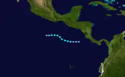A westward-moving tropical disturbance crossed Costa Rica and Panama into the East Pacific on June 17. The system was slow to organize initially, but developed into a tropical depression by 06:00 UTC on June 21. It further intensified and became Tropical Storm Blanca around 00:00 UTC on June 22. Blanca moved over warm waters and eventually attained peak winds of 50 mph (80 km/h) on June 22–23. The cyclone curved west-northwest and began to weaken, particularly after it encountered colder waters. It dissipated far away from land after 12:00 UTC on June 25.[4]