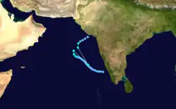 The monsoon trough spawned a tropical depression off the western Indian coast on November 12. It tracked generally northwestward, slowly organizing into a tropical storm on the 17th. The storm turned to the northeast, where it dissipated over the northeastern Arabian Sea.