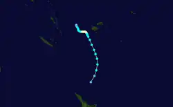 The tropical cyclone developed 160 km/100 mi northeast of western Samoa and travelled southwest at 12 knots, moving through the Ha'apai island group and only 50 km/30 mi northwest of Tongatapu. The pressure at Tongatapu fell to 976.4 mbar (28.83 inHg). Winds of 92 knots were measured at Nuku'alofa,[1] and rainfall of 120 millimetres (4.7 in) was measured there. Isaac reached maximum intensity on March 2. The tropical cyclone was the worst storm in Tonga's history, devastating the island group.[2] The island groups of Ha'apai and Vava'u were hit worst. Six were killed,[1] while 45,000 became homeless and 95% of the livestock was killed.[3] The island of Tatafa was bisected by a 16 metres (52 ft) wide channel caused by Isaac's storm surge.[4]