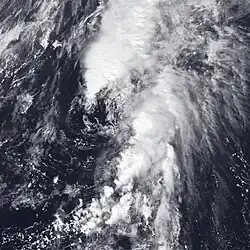 A cold front moved offshore North Carolina on July 30. An area of disturbed weather along the tail-end of the front subsequently began to develop cyclonic banding, resulting in the formation of a subtropical depression late on August 2 about 310 mi (500 km) northwest of Bermuda. After acquiring more central dense overcast, the subtropical depression transitioned into a tropical depression around 12:00 UTC on the following day. Soon, the depression also intensified into Tropical Storm Cindy late on August 3 about midway between Bermuda and Nova Scotia. Cindy tracked east-northeast until becoming extratropical on August 5 as it moved over colder sea surface temperatures to the southeast of Newfoundland.[9]