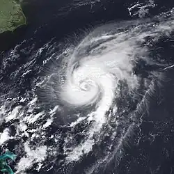 Floyd was first tracked as a tropical depression on September 3 when it organized east of the Leeward Islands. As the depression moved northwest, it caused heavy rain. The highest rainfall reported was 5.7 inches (140 mm) at Antigua. It strengthened into a tropical storm, then reached hurricane strength on September 7.[13] Floyd turned to the northeast and passed just southeast of Bermuda as a weakening hurricane. As a tropical storm, Floyd moved east across the Atlantic until losing its identity on September 12.[13]