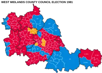 ![]() Map showing the results of the 1981 West Midlands County Council election by electoral division. | |||||||||||||||||||||||||||||||||