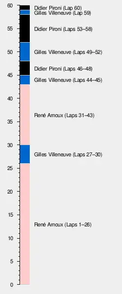 The 60-lap race was won by Frenchman Didier Pironi, driving a Ferrari, with Canadian teammate Gilles Villeneuve second and Italian Michele Alboreto third in a Tyrrell-Ford. After the Renaults of René Arnoux and Alain Prost retired, Villeneuve led from Pironi before the Ferrari team ordered both drivers to slow down, with Alboreto far behind. Villeneuve interpreted this as an order to maintain position on the track; Pironi did not and thus overtook Villeneuve on the final lap, infuriating the Canadian to the point that he vowed never to speak to Pironi again. Villeneuve would lose his life in a crash during qualifying for the Belgian Grand Prix two weeks later.