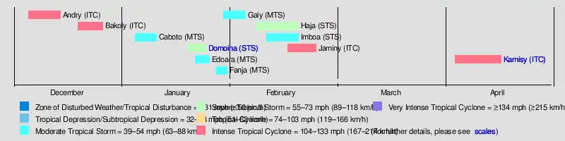 Less than two weeks after Domoina caused severe flooding in South Africa, Tropical Storm Imboa produced additional rainfall and high seas in the country, killing four people. The final storm of the season was Cyclone Kamisy, which caused $250 million in damage and 69 deaths when it made landfalls in northern and northwestern Madagascar. The cities near landfall were largely destroyed, and about 100,000 people were left homeless. The penultimate storm, Jaminy, was tied for the strongest storm in the basin after it crossed from the Australian region, where it was named Annette. Cyclone Fanja in January also crossed from the Australian region, where it was named Vivienne.