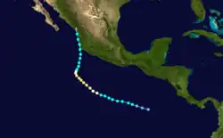 On July 30 and 31, a tropical disturbance crossed Central America. At a low latitude, a tropical depression was declared on August 3.[7] At first, the storm was expected to turn west-northwest,[17] but it continued west instead.[7] Nine-E failed to intensify despite being situated over warm water. The depression dissipated on August 7 later over somewhat cooler water.[7]