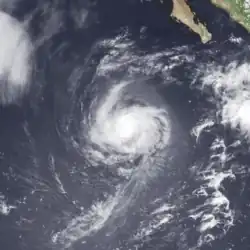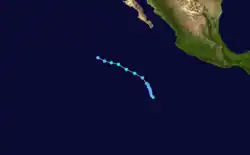 The origins of Hurricane Ismael were from a northward bulge of the Intertropical Convergence Zone (ITCZ) in early August, which resulted in the formation of a tropical depression on August 8. Six hours later, it was upgraded into Tropical storm Ismael. Continuing to intensity, Ismael was upgraded into a hurricane late on August 10 and subsequently developed an eye. The storm soon reached its peak of 100 mph (155 km/h). Late on August 11, Hurricane Ismael began to weaken as it encountered cooler waters and the hurricane was soon downgraded to a Category 1 on the SSHWS. The following day, Ismael was downgraded into a tropical storm about 380 mi (610 km) west of the Baja California peninsula. On August 14, the storm was downgraded into a tropical depression while centered about 250 mi (400 km) west of Point Ensenada.[7] Ismael dissipated that day.[3]