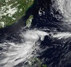 This system formed well north of the normal climatological position to the west of Dom, as the monsoon trough was similarly displaced. It was first noted on August 25, but showed no further development. Thunderstorms were located about 300 miles (480 km) south of the center, but since the central pressure was under 1000 mb, it was considered a tropical depression while an exposed low level swirl. The system did develop some central convection, and moved northward into South Korea, bringing showers to the region, and dissipated late on August 27.[17]