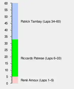 Brabham driver Riccardo Patrese had taken the lead from Tambay with six laps remaining, but only held the lead for half a lap before crashing at Acque Minerali. He later described the accident as "purely my mistake". Showing their love for Ferrari more than for an Italian driver in a non-Italian car, the Tifosi cheered as Patrese handed the lead back to Frenchman Tambay in his Ferrari to take his second and last F1 victory.[1]