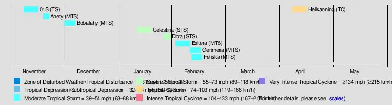 During the season, advisories were issued by Météo-France's (MFR) meteorological office at Réunion. At the time, the MFR area of warning responsibility was from the coast of Africa to 80° E, and the agency primarily used the Dvorak technique to estimate the intensities of tropical cyclones.[1] The Joint Typhoon Warning Center (JTWC), which is a joint United States Navy – United States Air Force task force that issues tropical cyclone warnings for the region,[2] also tracked a long-lived tropical storm in November in addition to the 8 storms MFR named,[3][4][5][6][7][8][9][10][11] which is comparable to the average of nine named storms per year.[12] Following the season, the boundary for the basin was extended to 90° E.[13]