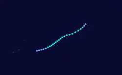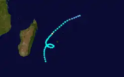 Well away from land, the JTWC reported that a tropical disturbance developed on January 1. Initially, the storm remained weak, but later on January 11, the JTWC noted that the system had intensified into a tropical storm. Continuing to intensify, the storm moved towards the southwest. On January 12, MFR first classified the system; within six hours, it was declared a moderate tropical storm. As Celestina made a turn towards the south-southwest, MFR estimated that Celestina attained peak intensity as a severe tropical storm at 0600 UTC on January 13. According to the JTWC, the storm briefly developed hurricane-force winds; however, Celestina began to weakened thereafter. Moving south, Celestina was situated roughly 350 mi (565 km) east of Madagascar. Furthermore, on January 15, Celestina briefly re-intensified while undergoing a counterclockwise loop. By January 18, Celestina resumed a weakening trend; by that night, MFR downgraded the system into a tropical depression as it was now moving south-southwest. The storm was re-upgraded into a moderate tropical storm three days later, on January 21. However, this trend was short lived and that evening, the JTWC stopped monitoring the system. MFR followed suit at 0600 UTC on January 23.[6] During its lifetime, Severe Tropical Storm Celestina brought rains to Reunion, peaking at 600 mm (25 in) in Trois-Bassins.[16]