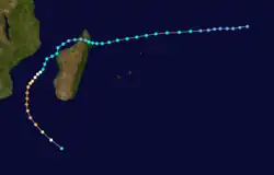During the season, the Météo-France office (MFR) on Réunion island issued warnings in tropical cyclones within the basin. Using satellite imagery from National Oceanic and Atmospheric Administration, the agency estimated intensity through the Dvorak technique, and warned on tropical cyclones in the region from the coast of Africa to 90° E, south of the equator. The World Meteorological Organization recognized the MFR as a Regional Tropical Cyclone Advisory Centre in 1988, and would later label the agency as a Regional Specialized Meteorological Center in 1993.[1] The Joint Typhoon Warning Center (JTWC), which is a joint United States Navy – United States Air Force task force, also issued tropical cyclone warnings for the southwestern Indian Ocean.[2] The season's nine named storms is equal to the long term average, while the five tropical cyclones – a storm attaining maximum sustained winds of at least 120 km/h (75 mph) – was slightly below average.[3] The MFR considered the tropical cyclone year to begin on August 1 and continue to July 31 of the following year.[1]
