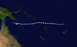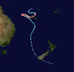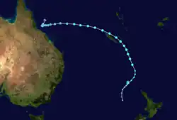 The tropical low that was to develop into Tropical Cyclone Delilah, was first noted within the South Pacific convergence zone during 28 December to the northeast of Townsville in Queensland, Australia.[3] Over the next few days the system moved eastwards and slowly intensified further before TCWC Brisbane named it Delilah, during 1 January after it had developed into a category 1 tropical cyclone on the Australian scale.[3][4] Later that day as the system started to move south-eastwards it crossed 160°E and moved out of the Australian region into the South Pacific basin.[3][5]