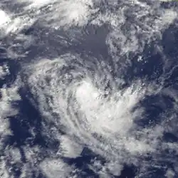 On 5 May Tropical Cyclone Meena moved into the Australian region, from the South Pacific region as a category 1 tropical cyclone.[23] During the next day the system continued to move towards the southwest, before the BoM estimated during 6 May that the system had reached its peak intensity with 10-minute sustained wind speeds of 85 km/h (55 mph).[23][24] At around the same time the JTWC also estimated that the system had peaked as a tropical storm, with 1-minute sustained wind speeds of 95 km/h (60 mph).[25] Over the next couple of days the system weakened as it moved westwards, before it made landfall on the Cape York Peninsular during 9 May.[23][24] The systems remnants subsequently emerged into the Gulf of Carpentaria, where they dissipated during the following day.[23] There were no reports of any damage to the Cape York Peninsula though it was noted that Meena may have been responsible for some minor damage to the Peninsula.[23][24]