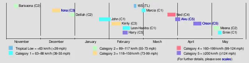 | Harry | 13–17 February | Category 5 severe tropical cyclone | 205 km/h (125 mph) | 925 hPa (27.32 inHg) | None | None | None | |