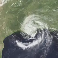 Early in its duration the system dropped moderate amounts of rainfall across the Yucatán Peninsula.[47] Upon striking Louisiana, storm surge water levels rose moderately above normal just east of where the center moved ashore.[48] Gusty winds caused power outages to more than 100,000 people. In Alabama one man died while trying to secure his boat. Rainfall from the hurricane caused severe river flooding in portions of the Florida Panhandle in an area already severely affected by heavy rainfall, and the flooding damaged or destroyed dozens of houses in Santa Rosa County.[49]