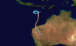 Upon passing over the Monte Bellos Islands and Barrow Island, gusts to 205 km/h (127 mph) were recorded. Effects from the system were mostly limited to the islands offshore. In the Monte Bellos, a mine was extensively damaged. Due to a 1.6 m (5.2 ft) storm surge, a landing stage on Barrow Island sustained minor damage.[6] On the Australian mainland, damage from the storm was minimal.[7]