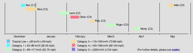 Adel 11 – 16 May Category 3 severe tropical cyclone 120 km/h (75 mph) 970 hPa (28.64 inHg) Papua New Guinea Minimal 3 [8][9]