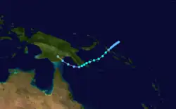 Adel lasted from 11–16 May 1993. During its life, it passed over Bougainville Island and near Goodenough Island, leaving two drowned and a total of at least 15 missing. Leaves were blown from trees, and 345 houses were destroyed, along with a radio tower that was bent over.[4] The track, especially its intensity and formation area, are highly unusual as a tropical cyclone in this region (the north coast of Papua New Guinea) has occurred less than 10 times in history.