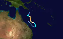 Developed in the Coral Sea far offshore from Queensland. The cyclone intensified to a Category 3 severe tropical cyclone before crossing out of Australian region on 1 March where it passed to the southwest of New Caledonia.[3]