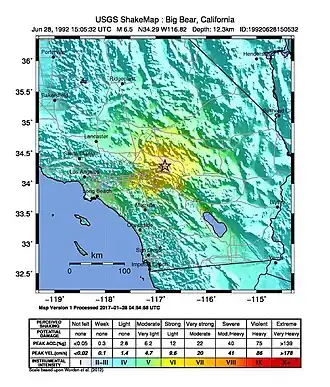 The 1992 Big Bear earthquake occurred at 08:05:33 PDT on June 28 in Big Bear Lake, California, with a moment magnitude of 6.5 and a maximum perceived intensity of VIII (Severe) on the Mercalli intensity scale. The earthquake occurred at a relatively shallow depth of 5 kilometers (3.1 mi).