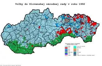 Parliamentary elections were held in Slovakia on 5 and 6 June 1992 alongside federal elections. The Movement for a Democratic Slovakia emerged as the largest party, winning 74 of the 150 seats in the National Council and forming a minority government under Vladimír Mečiar. The threshold had been raised from 3% (for the Slovak parliamentary election in 1990) to 5%.