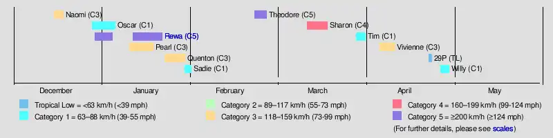 Rewa 26 December – 23 January Category 5 severe tropical cyclone 205 km/h (125 mph) 920 hPa (27.17 inHg) Melanesia, Eastern Australia, New Zealand Unknown 22