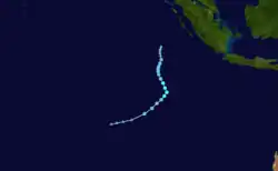 During 29 January, the BoM reported that a tropical low had developed within the monsoon trough, to the north of the Gove Peninsula in the Northern Territory.[7][8] During that day the low rapidly developed further as it moved south-eastwards, before early on 29 January the BoM's TCWC Darwin reported that the low had developed into a category 1 tropical cyclone and named it Sadie as the system started to move southwards.[7] Later that day the JTWC initiated advisories on Cyclone Sadie and designated it as Tropical Cyclone 14P, while the system started to move towards the east and was near its peak 1-minute maximum sustained windspeeds of 85 km/h (50 mph).[7][9][10] Early the next day Cyclone Sadie made landfall to the north of near Normanton, after the BoM had reported that the system had peaked with 10-minute maximum sustained winds of 85 km/h (50 mph).[7][8][10] After making landfall, the system moved towards the south-southeast before weakening and degenerating into a tropical low/rain depression later that day.[7]