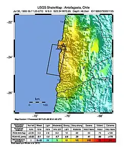 At 1:11 local time on July 30, 1995, a large earthquake struck northern Chile. The Mw  8.0 earthquake struck at a depth of 46 km (29 mi) with an epicenter near Antofagasta.[1] The focal mechanism of this earthquake indicates thrust faulting along the subduction zone, which is consistent with other large earthquakes along the plate boundary in this region.[11][12] The maximum slip was 5.4 m (18 ft) along a 180 km × 70 km (112 mi × 43 mi) zone of rupture.[13][11][14] Foreshock activity was minimal, but large aftershocks lasted a while after the mainshock, with the largest being a shallower Mw  6.4 event with a Modified Mercalli Intensity of VII three days later.[15] The event occurred at the edge of a known seismic gap that produced the 1877 Iquique earthquake, and research suggests that this earthquake may have put more stress on the region as well.[16] The event is not thought to have ruptured the shallow plate interface in the region, leaving it susceptible to future large megathrust earthquakes such as the 1877 event.[16]