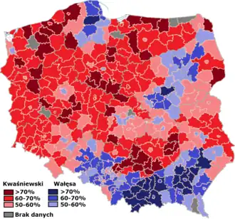 Presidential elections were held in Poland on 5 November 1995, with a second round on 19 November.[1] The leader of Social Democracy, Aleksander Kwaśniewski, and incumbent President Lech Wałęsa advanced to the second round. Kwaśniewski won the election with 52% of the vote in the run-off against 48% for Wałęsa.